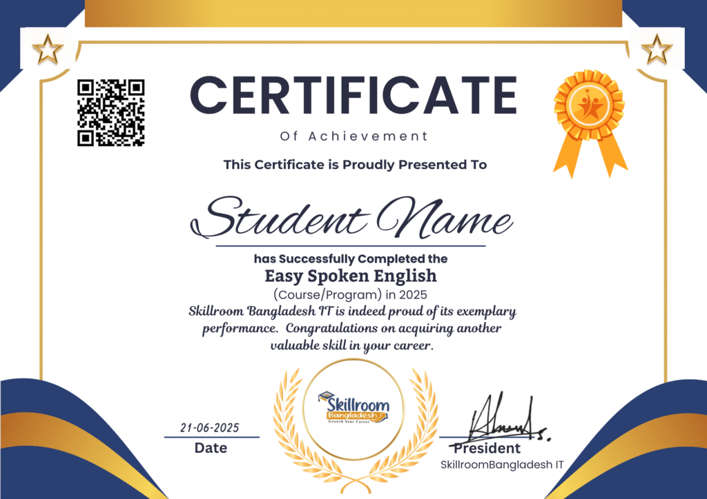 শেখানো হয়: Greetings, Question-Answer Skills, Daily Conversation, Grammar Basics, Confidence Building, Presentation Skills, এবং আরও অনেক কিছু।