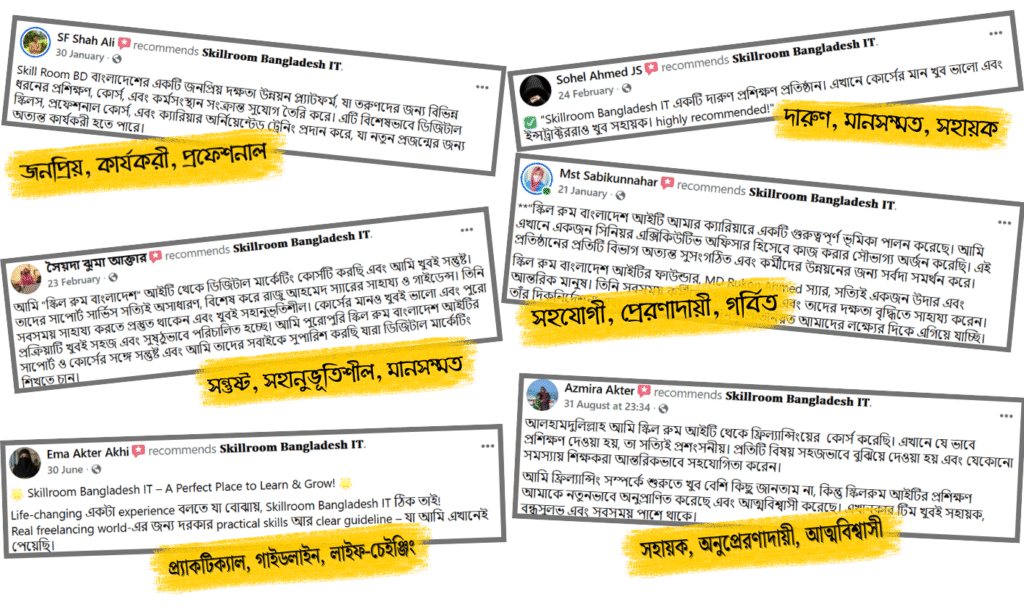 Conversation Skills, Grammar Basics, Listening, Pronunciation, Public Speaking, Interview Skills ইত্যাদি।
